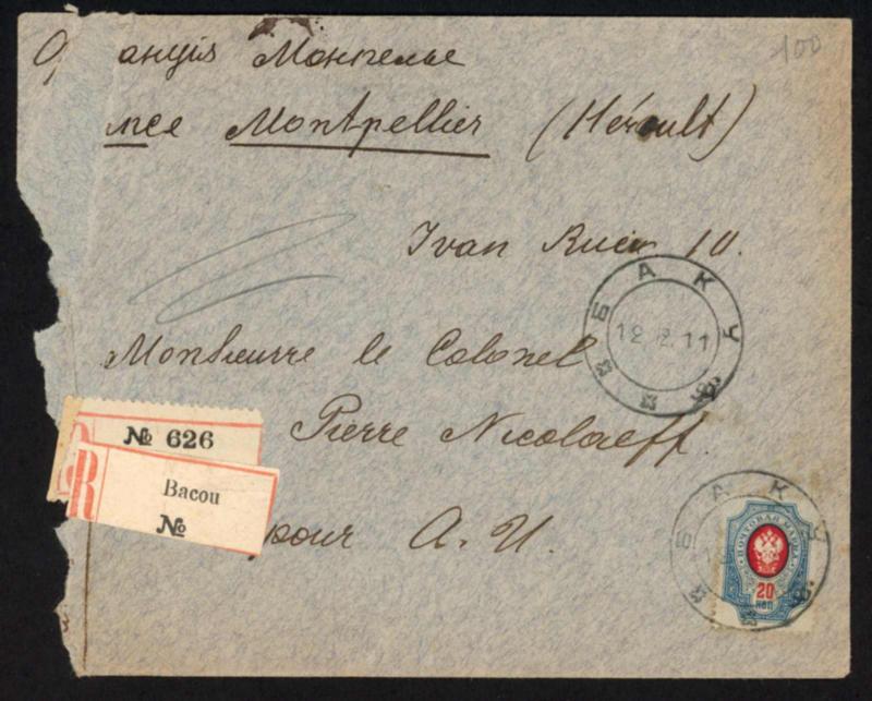 BAKU, Einschreibbrief von 1911 mit EF Russland 20 Kop. nach Montpellier/Frankreich, 2 verschiedene R-Zettel, links Öffnungsmängel (Image)