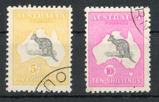 1917/18, 5 und 10 Sh. Landkarte/Känguruh, zwei gest. Einzelwerte mit dem Wz. 4, farbfrisch und gut gezähnt, einwandfrei (Image)