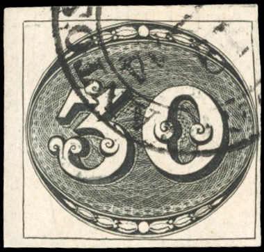 1843, 30 Reis Ziffer im Oval schwarz, sog. Ochsenauge, gest. Einzelwert, farbfrisch und voll- bis breitrandig, entwertet mit Teilabschlag des DKr. "SANTOS" aus 1844, einwandfrei, Fotoattest Juchert BPP (ME 800,-) (Image)