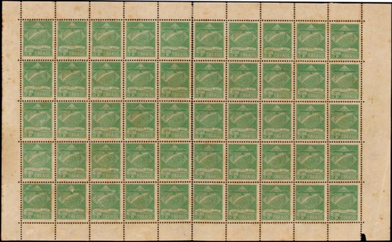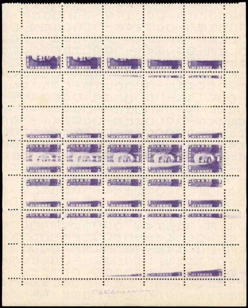 1927, Syndicato Condor LTDA, 1.300 R. Landesfahne u. Firmenzeichen ohne Inschrift "SYNDICATO CONDOR" (hell)blaugrün kpl. Druckbogen zu 50 Werten, ungebraucht, ohne Gummi, der Bogen im Papier etwas getönt und mittig angetrennt, teils mit Falz gestützt, selten angeboten, da die meisten Marken dieses Wertes später überdruckt wurden (ME für ungebr. 2. 500,-) (Image)