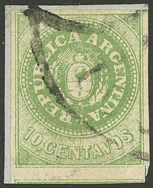 GJ.8, 10c. yellow-green, with accent, on small fragment with TUCUMAN cancel with FRANCA in fan, VF (Image)