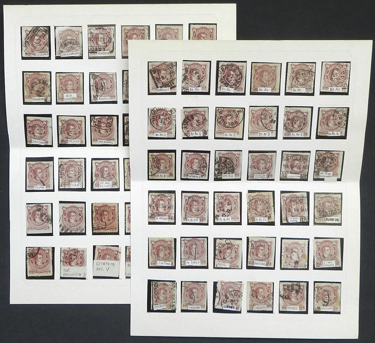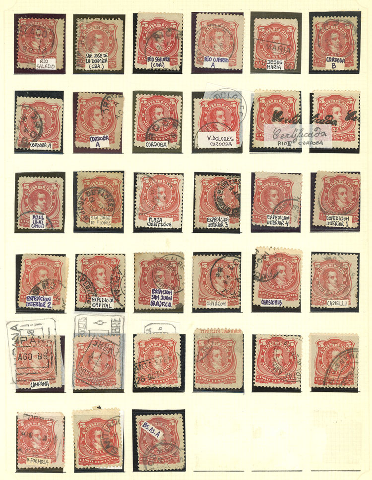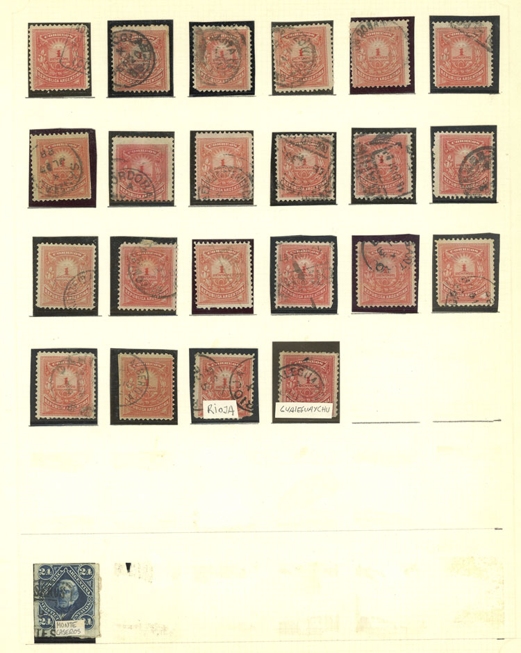GJ.78, 1c. Little Envelope, album page with 22 used stamps with varied cancels, also 24c. San Martín rouletted with cancel of Monte Caseros, VF quality (Image)