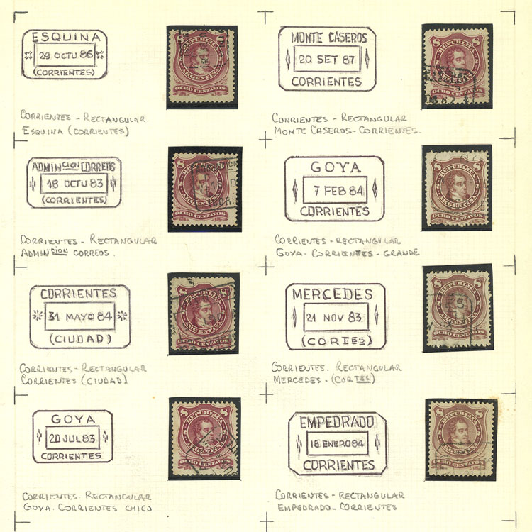 GJ.54, 8c. Rivadavia, album page with 12 used stamps with varied cancels of the province of Corrientes, VF (Image)