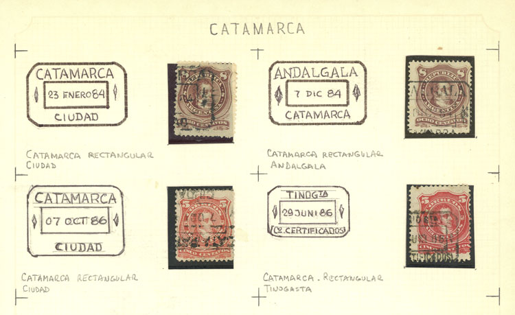 GJ.54 + 84, 5 and 8c. Rivadavia, 4 stamps with cancels of the province of Catamarca, VF (Image)