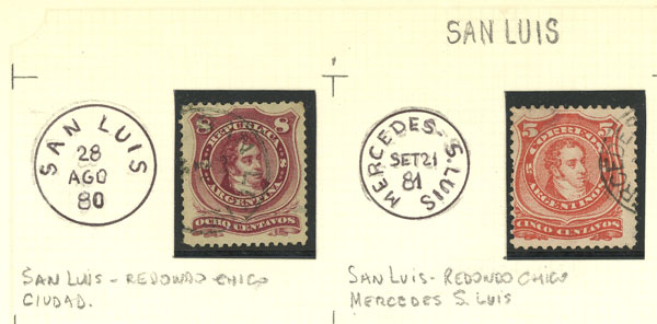 GJ.54 + 84, 5 and 8c. Rivadavia, used with cancels of the province of San Luis, VF (Image)