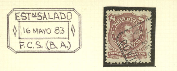 GJ.54, 8c. Rivadavia, used with datestamp of Río Salado, VF quality (Image)