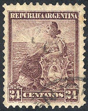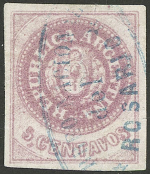 GJ.12, 5c. without accent, semi-worn plate, in rare lila-ish light rose color, used with Rosario cancel, very good front with ample margins, defects (Image)
