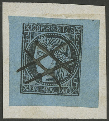 GJ.1, 1 Real, blue, type 4, on fragment with pen cancel, VF quality (Image)