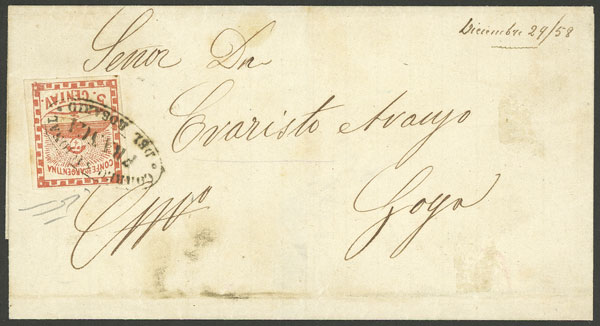 GJ.1, 5c. red, small figures, on folded cover sent to Goya on 24/DE/1958, with double ellipse cancel "Correos Nac. del ROSARIO" with FRANCA, VF quality, signed by Alberto Solari (Image)