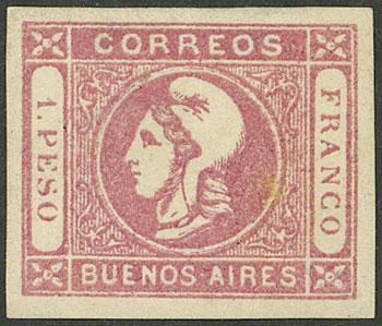 GJ.21, 1P. rose, semi-clear impression, beautiful example mint without gum, wide margins and very fresh. It has a tiny thin on back, barely visible and insignificant, very handsome! (Image)