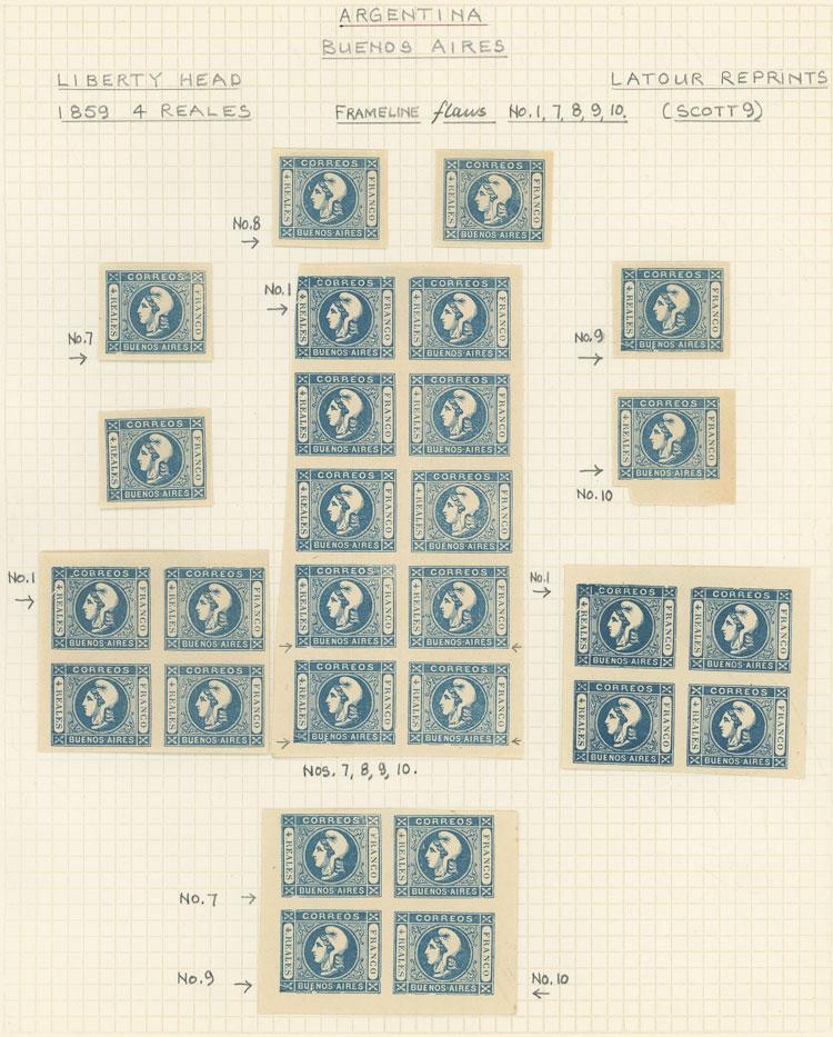 COLLECTION OF REPRINTS AND FORGERIES on 12 album pages, with more than 340 stamps as singles, pairs, blocks and complete sheets, all expertly classified and described, with indications of the varieties, and more. A very attractive lot, a very interesting collection for the expert. IMPORTANT: Please view ALL the photos of the lot, because all the stamps have been scanned. (Image)