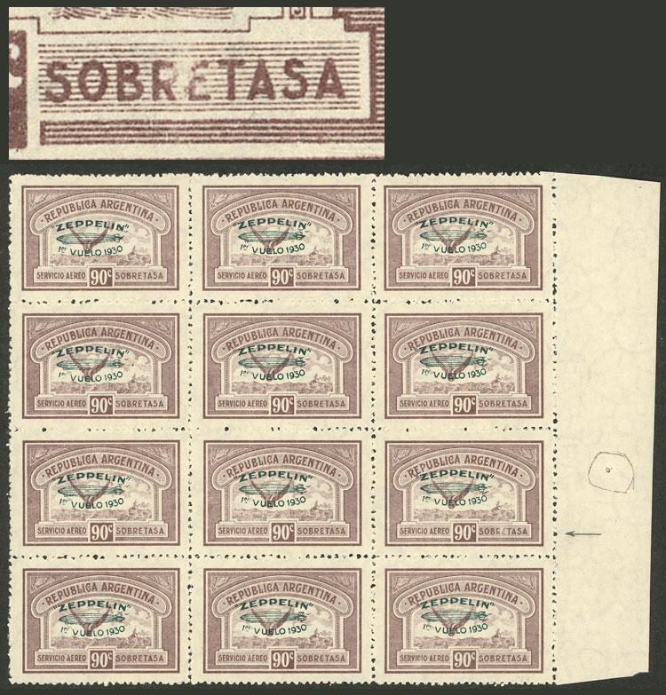 GJ.667b, 1930 90c. Zeppelin with green overprint, large block of 12, one with the "SOBPETASA" variety, MNH (+40%), superb quality! (Image)