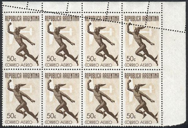 GJ.860, 1942 50c. Mercury & airplane, printed on CHALKY PAPER, fantastic corner block of 8 with partial and very shifted DOUBLE PERFORATION in the top stamps, excellent quality. Valor of 8 normal stamps US$120! (Image)
