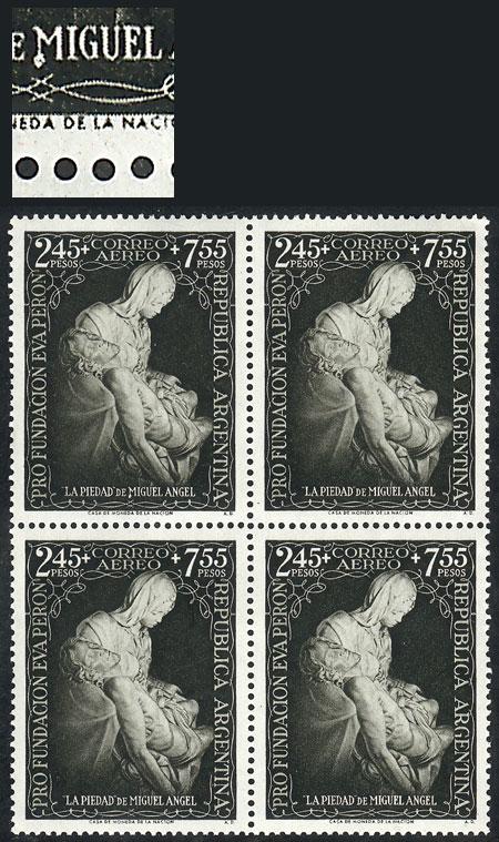 GJ.1002a, 1951 Eva Perón Foundation (La Pieta, Michelangelo), block of 4, one with variety "M of MIGUEL with period" (position 17), MNH, excellent quality, catalog value US$75 (Image)