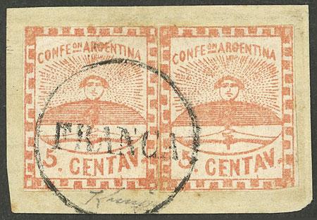 GJ.1, 5c. red, 2 stamps on fragment with black double circle "FRANCA" cancel of Concordia, signed by Victor Kneitschel, VF (Image)