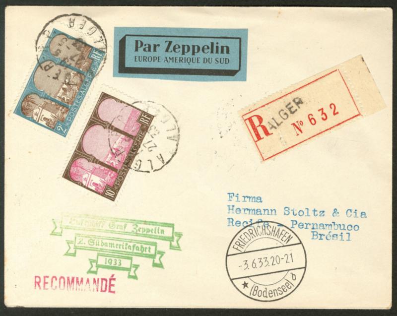 Zeppelin "2 SüdAmerikaFahrt". Poste 54 + 84, obl cad 27.5.33 sur enveloppe avec CS, recommandée, d'Alger pour Pernambuco avec arr. - TB (Image)