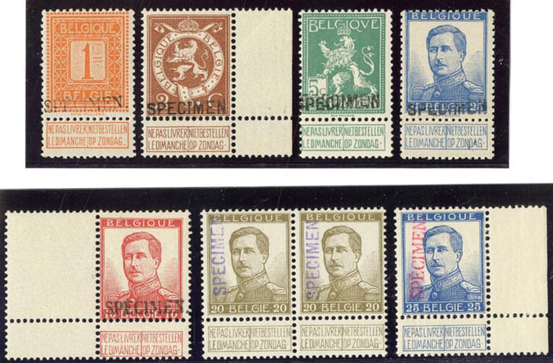 Surchargés "SPECIMEN". Nos 108, 109 bdf, 110, 120, 123 bdf, 124 paire, 125 bdf, en noir, violet ou rouge. - TB (Image)