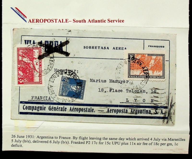 Argentina 1931 3v on Aeropostale-South Atlantic Service cover from Buenos Aires via Marseille to Lyon France (Image)