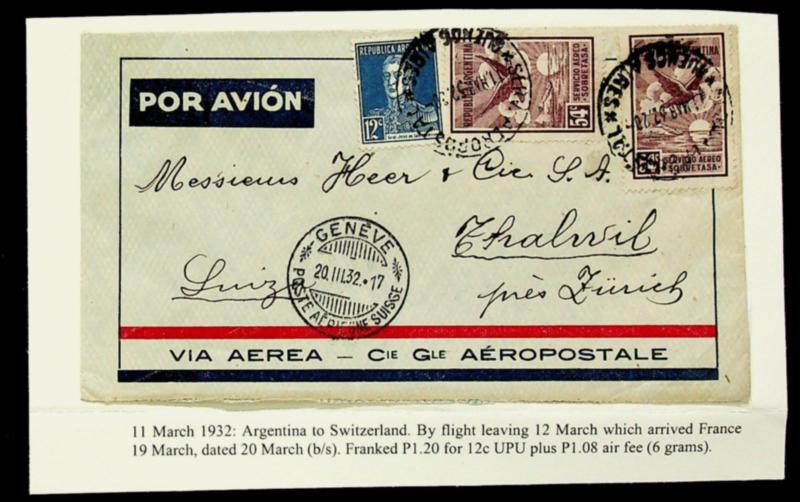 Argentina 1932 3v on Aeropostale-South Atlantic Service cover from Buenos Aires via France to Thalwil Switzerland (Image)