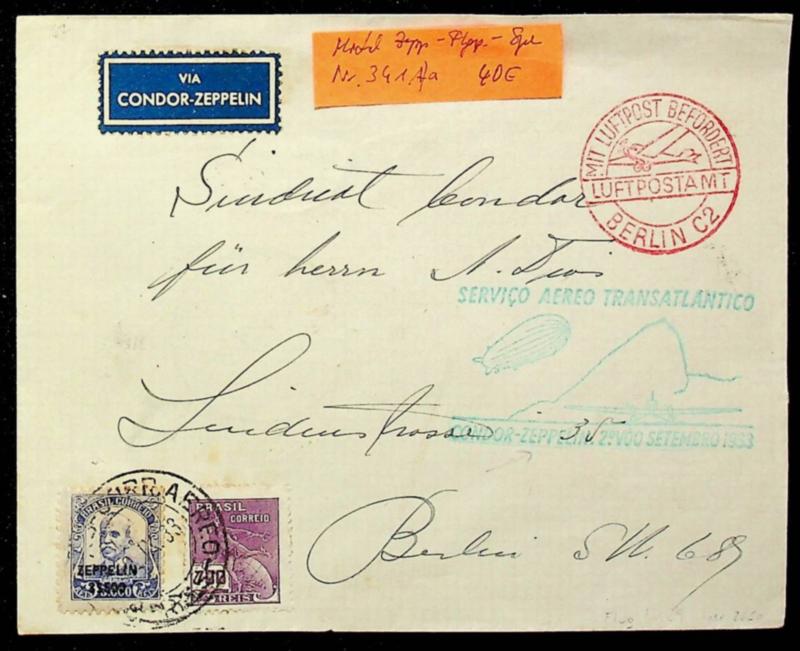 Brazil 1933 2v, 1 w/ s/c on Transatlantic airmail cover by Condor-Zeppelin via Friedrichshafen to Berlin Germany (Image)