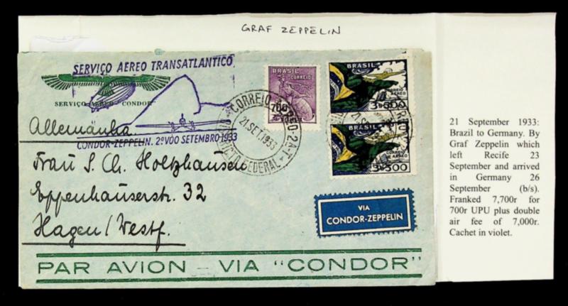 Brazil 1933 3v on Transatlantic airmail Condor-Zeppelin cover via Friedrichshafen to Hagen Germany (Image)