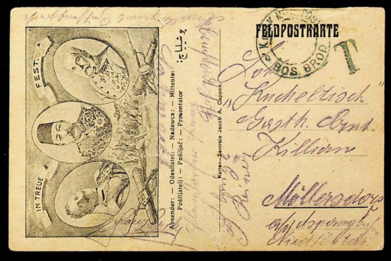Austria Hungary Bosnia Herzegovina 1915 WWI Leaders illustrated Taxed "KuK Milit. Post, Bos. Brod" Feldpost card to Mollersdorf (Image)