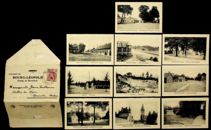 Belgium 1931 10 souvenir PPC depicting Bourg-Leopold, Camp de Beverloo w/ folder from Leopoldsburg to Marcinelle Charleroi (Image)