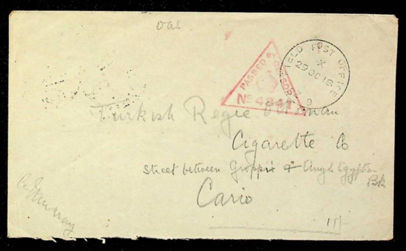 Lebanon Tripoli 1918 WWI OAS British Army FPO-SZ9 passed censor cover to Cairo Egypt (Image)