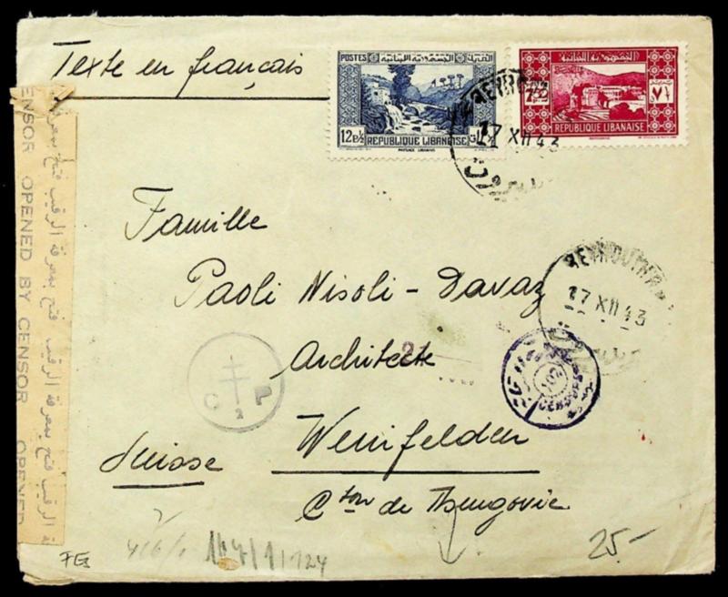 Lebanon 1943 WWII, 2v censored cover from Beirut to Weinfelden Switzerland (Image)
