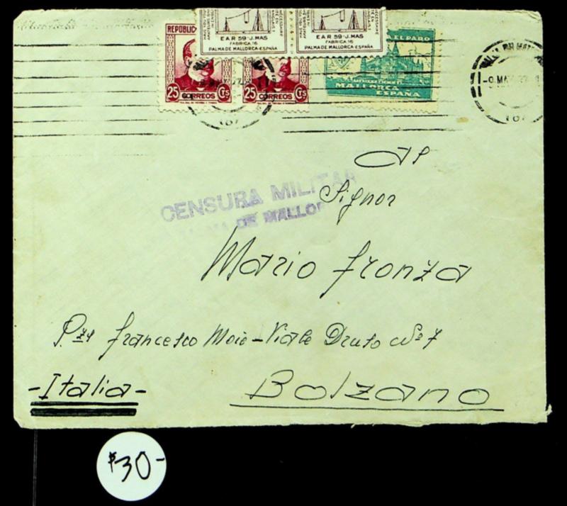 Spain 1937 3v on Military Censored cover to Italy w/ pair labels (Image)