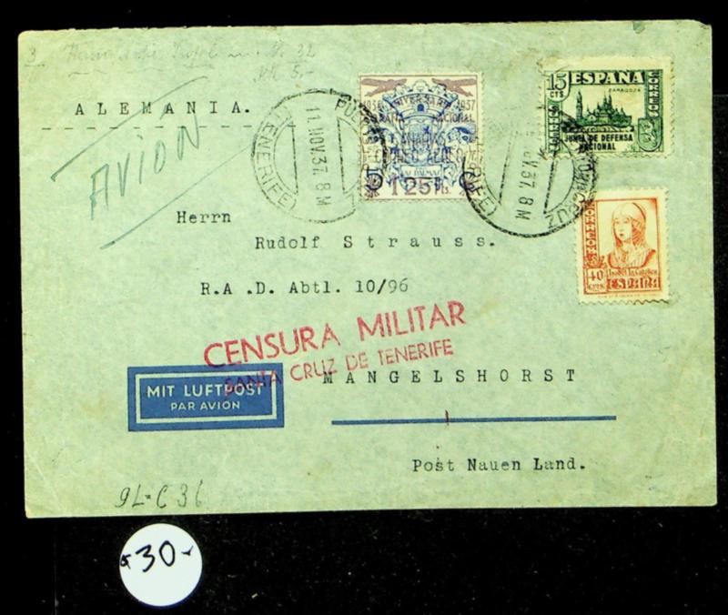 Spain 1937 3v on Military Censor passed Airmail cover to Germany (Image)