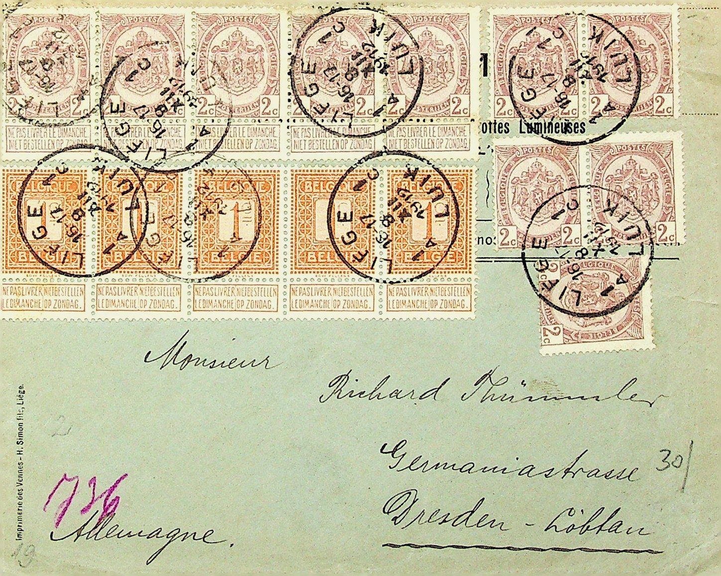 Belgium 1912 5x1c+10x2c on cover from Liege to Dresden Germany(Image 1)