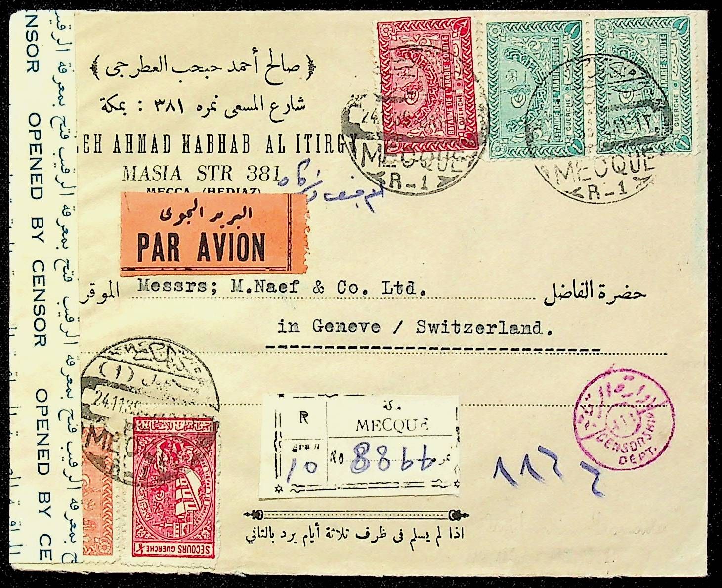 Saudi Arabia 1939 WWII 5v airmail regd censored rare cover via Cairo/Brindisi by surface to Geneva Switzerland(Image 1)