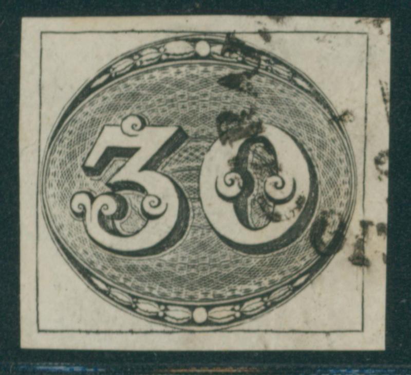 Brazil 1843 30r used stained, full margin, cancelled by datestamp catalog value:75,000YEN (Image1)