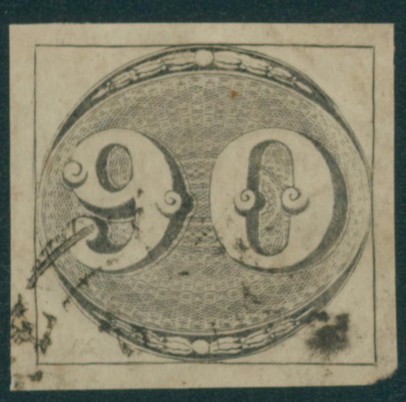 Brazil 1843 90r used stained, full margin, catalog value:190,000YEN (Image1)