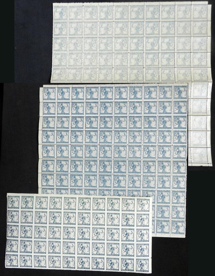 Sc.3L12, 1919/20 15f. blue, sheet of 100 stamps printed on thin paper with OFFSET IMPRESSION ON BACK, also a block of 50 printed on thick paper and rouletted (Sc.3L26), MNH, VF quality! (Image)