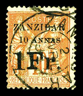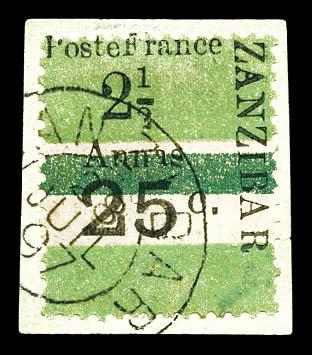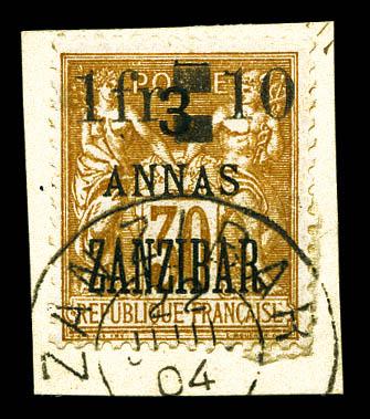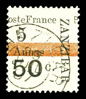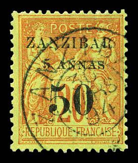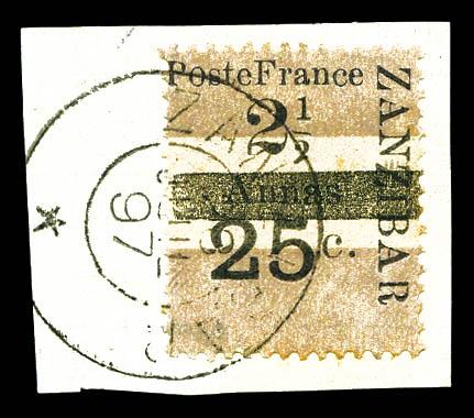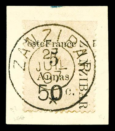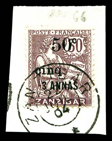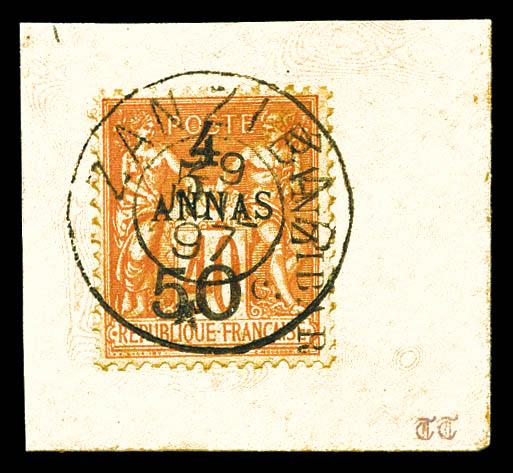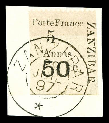 N°41, 5 anna paille type IV obl càd ZANZIBAR du 27 juillet 1897 sur son support. SUPERBE. R.R. (signé Champion/certificats) Qualité: Oblitéré Cote: 5775 euros (Image)