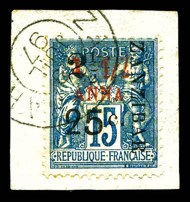 N°43b, 2 1/2 annas lilas pâle, type III (position F) sur son support. SUPERBE. R.R. (signé Calves/Brun/certificats) Qualité: Oblitéré Cote: 6850 euros (Image)