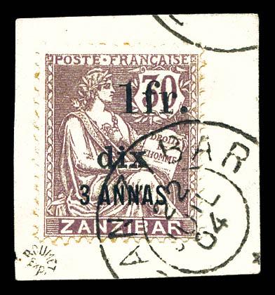 N°67, 1fr et dix sur 3 annas sur 30c violet oblitéré càd sur son support. SUP. R.R. (signé/certificats) Qualité: Oblitéré Cote: 2680 euros (Image)