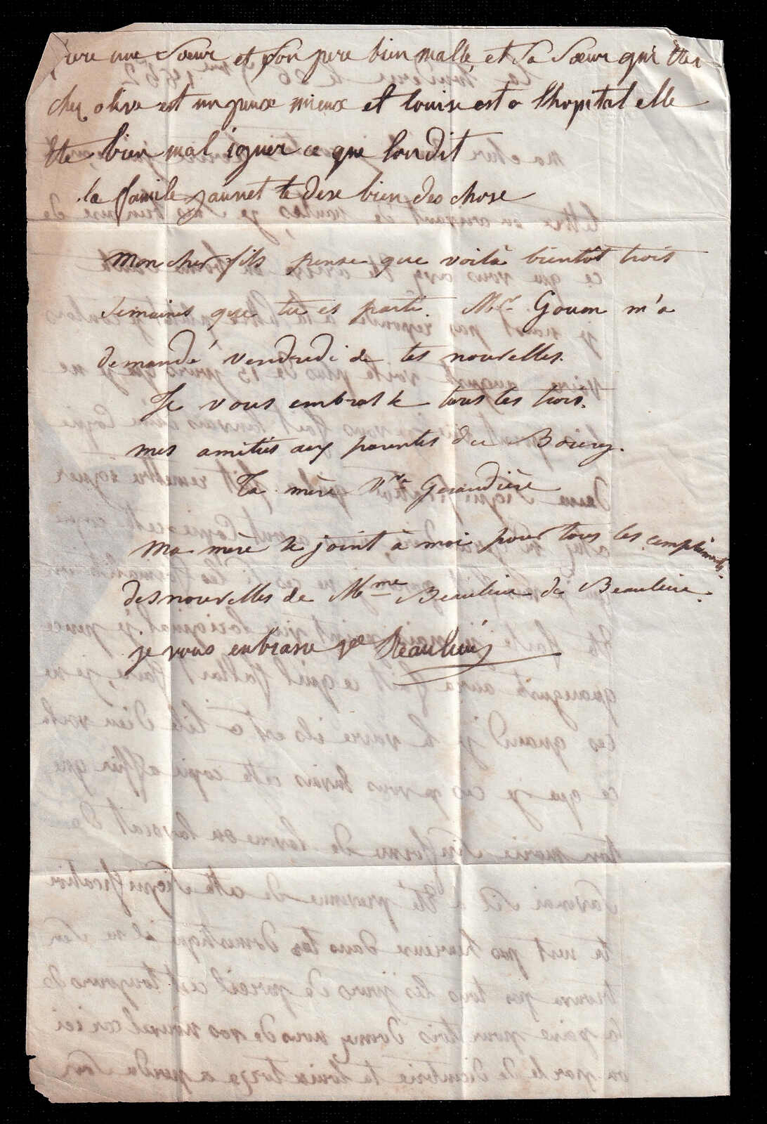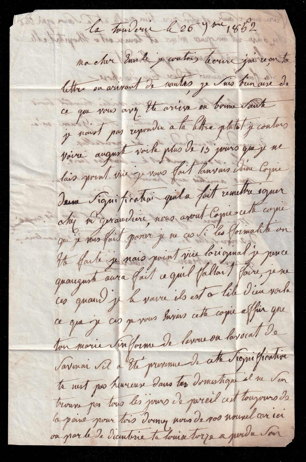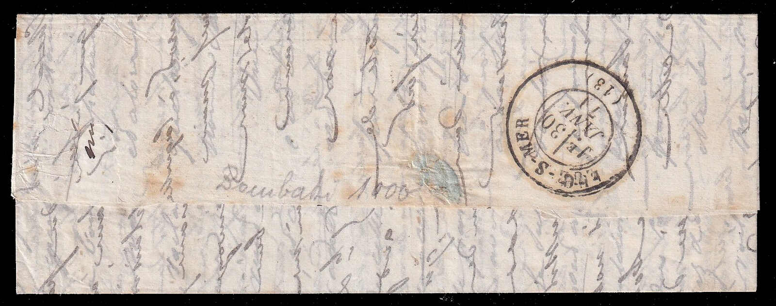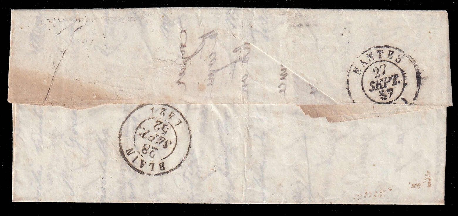 563 cover   image1857 (September 27), stampless folded letter carried by steamship Paimbœuf, datelined La Touraine (26 Jun) and addressed to Châtillon-sur-Indre, bearing clear circular Bateau à Vapeur / Paimbœuf handstamp (27 Sept) on front with matching Paimbœuf c.d.s. on reverse, routed inland with Blain transit/arrival (28 Sept), the front additionally struck with large manuscript “25” in outlined numerals denoting postage due in centimes, with contents comprising a four-page manuscript letter discussing family matters, health and legal affairs, light aging but overall quite fresh and fine-very fine. (Image 1) (Image 2) (Image 3) (Image 4)