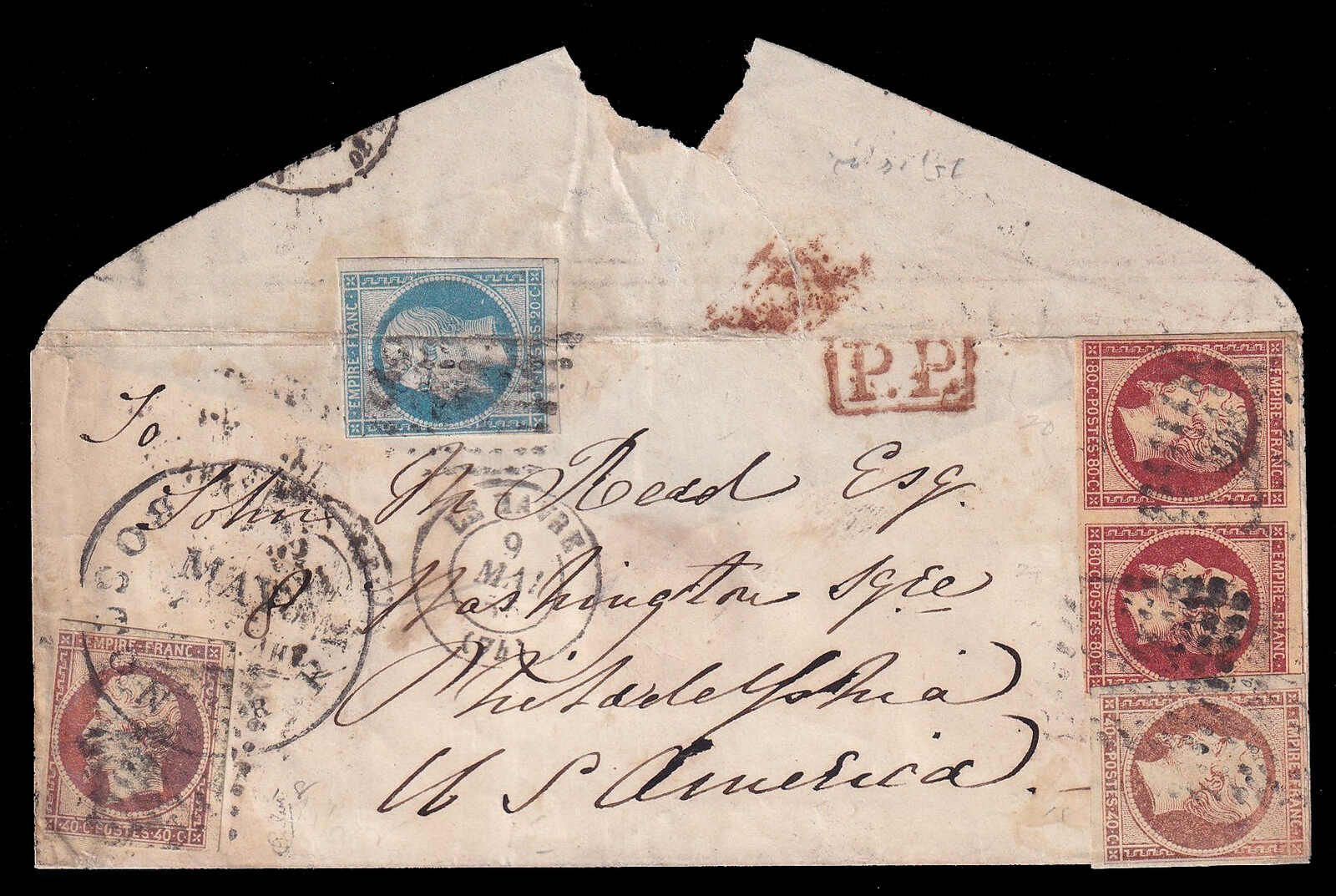 562 cover   image1855 (May 9), Napoleon franking transatlantic cover to United States, with 10c blue, two 40c orange and a pair of 80c red imperforate Emperor Napoléon III issues, cancelled by grilled lozenge obliterators, struck with red boxed P.P. (Port Payé) and Le Havre c.d.s. (9 May), additionally bearing large circular Boston Br. Pkt c.d.s. the reverse with Le Havre à Paris TPO c.d.s. (9 May), minor oxidation affecting one 40c and the 10c affixed overtop of envelope, otherwise sound and attractive, a desirable multi-colour franking. (Image 1) (Image 2)