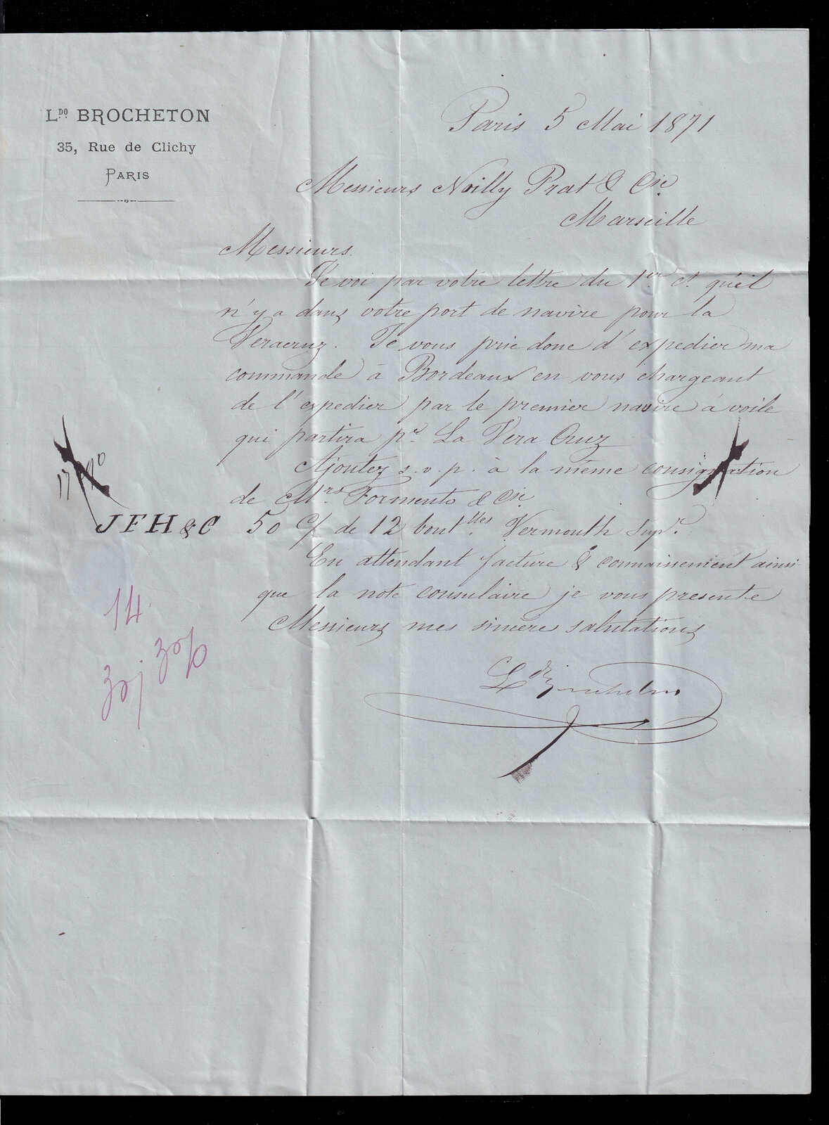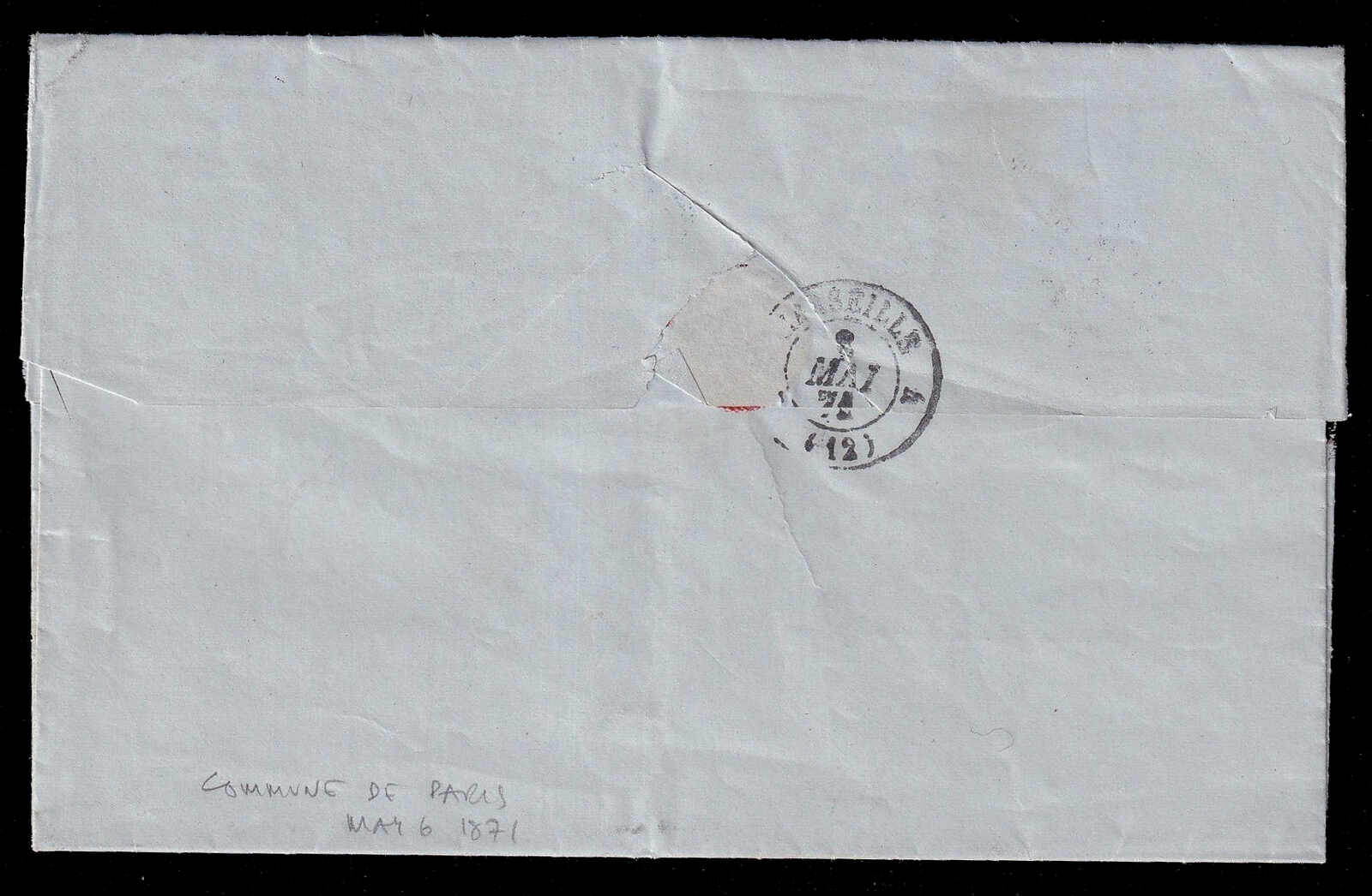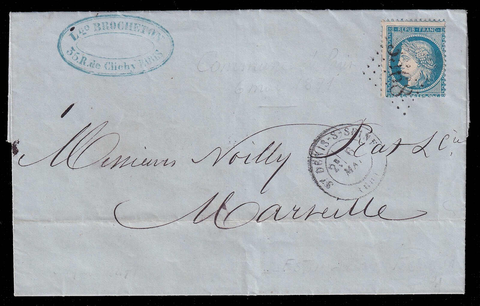 565 cover   image1871 (May 6), Paris Commune period folded letter, Paris via St-Denis to Marseille, commercial folded letter on printed letterhead of Lᵈ Brocheton, 35 Rue de Clichy, dated internally Paris (5 May), franked with 20c Cérès perforated issue tied by large numeral “3568” with matching St-Denis-S-Seine double-circle c.d.s. (6 May), addressed to Marseille with arrival c.d.s. (8 May) on reverse, routed out of Paris via St-Denis, contents present, light creasing and minor edge wear, otherwise a sound example of mail dispatched during the Paris Commune following the lifting of the siege. (Image 1) (Image 2) (Image 3)