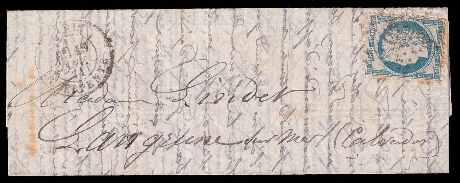 564 cover   image1871 (January 19), Balloon Monté cover, Paris to Langrune-sur-Mer, folded letter, with contents, franked with 20c Cérès perforated issue, tied by star cancel with matching Paris Rue Serpente c.d.s. (19 Jan), addressed to Calvados with clear Langrune-sur-Mer receiver on reverse (30 Jan), likely carried on the Général Bourbaki, light age toning, otherwise sound, a pleasing Balloon Monté usage to the Normandy coast. (Image 1) (Image 2) (Image 3) (Image 4) (Image 5)