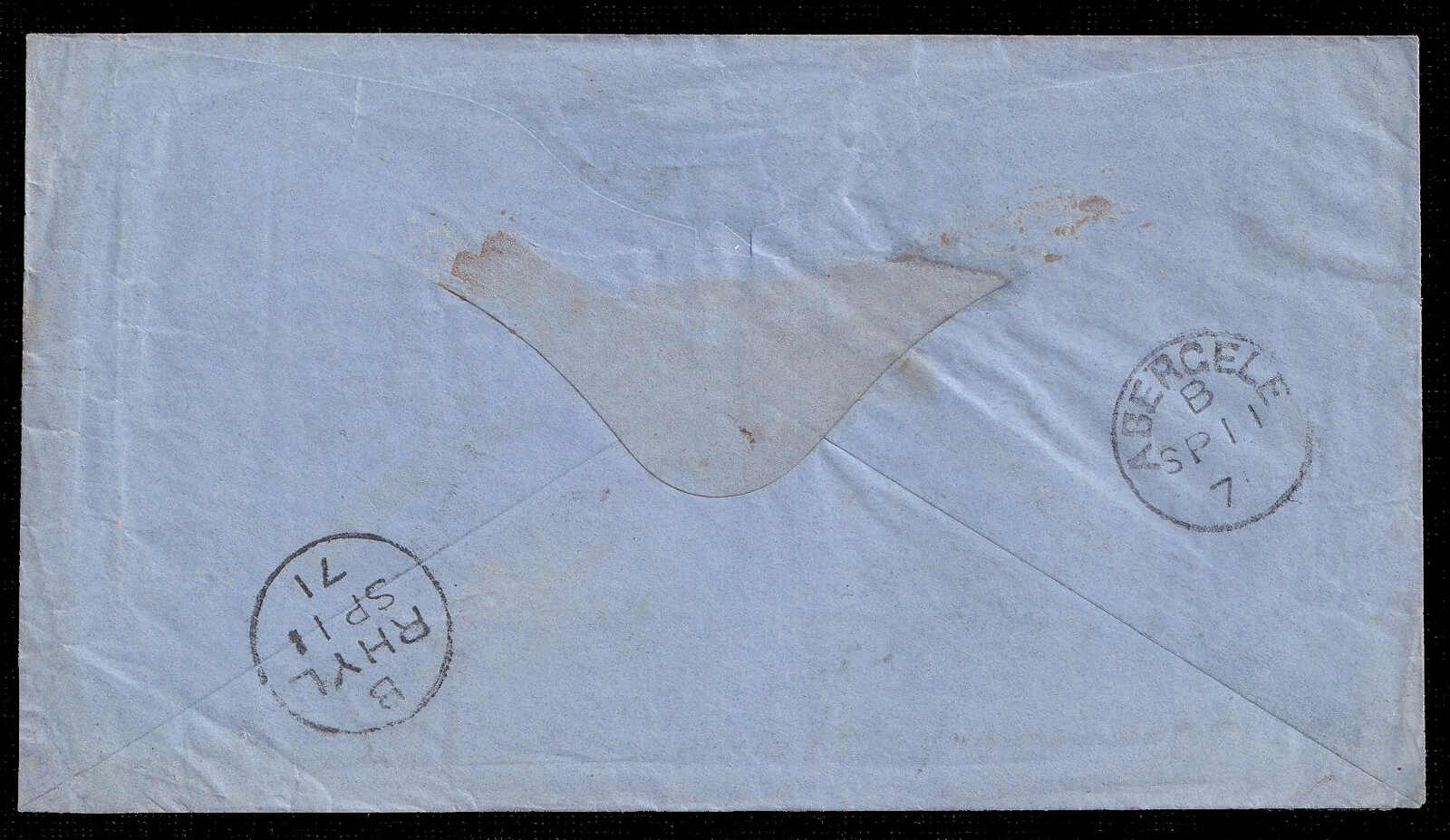 566 cover   image1871 (September 8), multi-franked imperforate Cérès cover, Pau to Llandulas, North Wales, Great Britain, franked with a vertical strip of four and a vertical pair of 5c Cérès imperforates, tied by multiple lozenge “2795” grid cancellations with matching Pau c.d.s. (8 Sept), front struck with small red boxed P.D.indicating prepaid, the reverse with Rhyl “B” transit and Abergele “B” receiver (11 Sept), bottom backflap removed, otherwise sound and well presented, a scarce multi-franked imperforate Cérès usage to Wales. (Image 1) (Image 2)