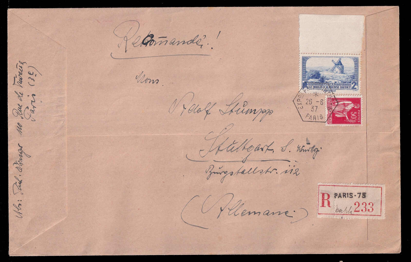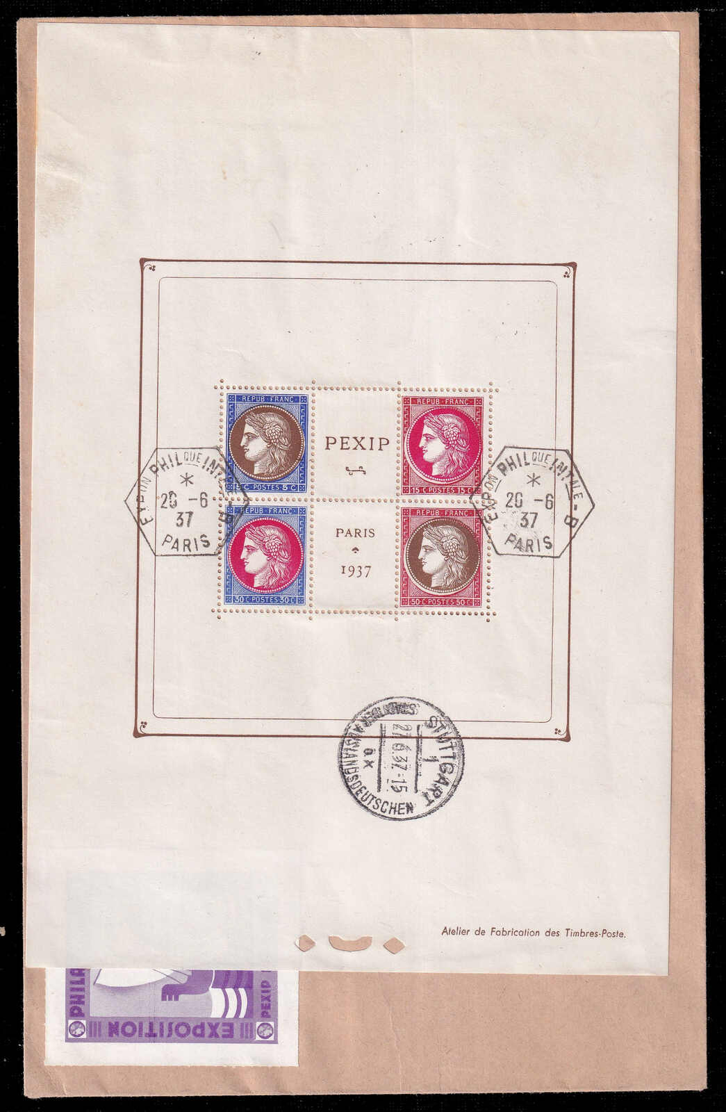 572 cover   image1937 (June 25), registered PEXIP exhibition cover, large envelope bearing the PEXIP – Paris International Philatelic Exhibition 1937 perforated sheetlet of four Marianne values (5c, 15c, 30c, 50c), tied by opposing hexagonal Exposition Philatélique Internationale / Paris cancels (20 Jun), the reverse further franked with 50c definitive and 2fr commemorative tied by matching exhibition cancel, addressed to Stuttgart, Germany, with c.d.s. receiver (27 Jun) at foot of the sheetlet, light edge wear and mild toning, otherwise sound, an attractive and visually striking registered exhibition cover combining a complete PEXIP sheetlet with clean exposition cancellations. (Image 1) (Image 2)