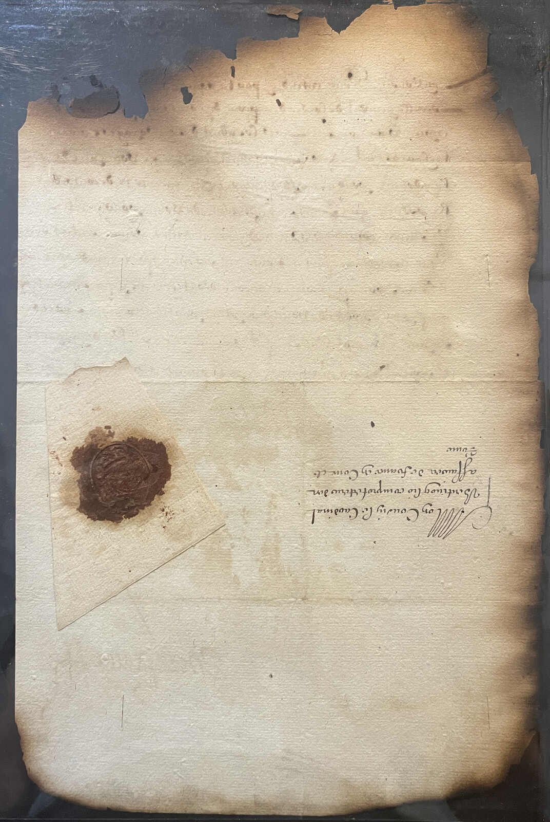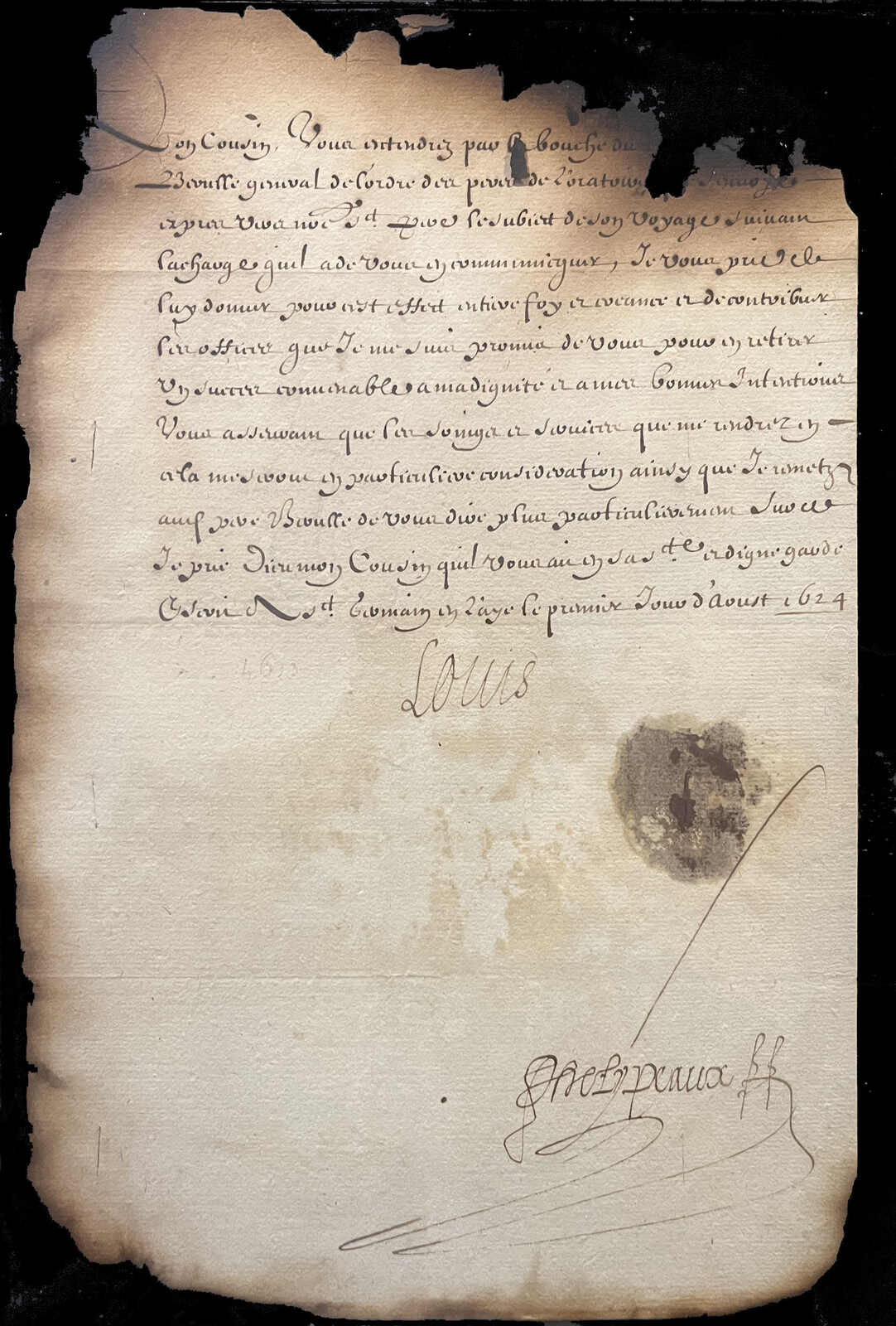 573   imageLouis XIII of France (1601–1643), King of France and Navarre, large part letter signed “Louis,” written from Saint-Germain-en-Laye on 1 August 1624 and addressed in French to the Italian cardinal and statesman Guido Bentivoglio d’Aragona in Paris, the reverse with armorial wafer seal (now detached), the letter affected by fire on three sides, fragile thus, but with only a small loss to the text, yet remaining highly legible, including the signature, a rare and desirable royal autograph from the reign marked by the consolidation of royal authority under Cardinal Richelieu and France’s struggles against the Huguenots and Spain. (Image 1) (Image 2)