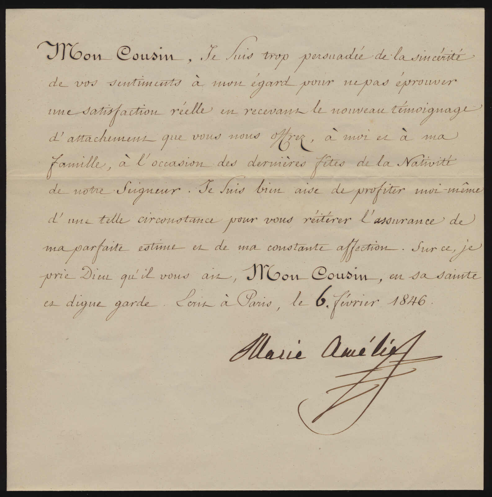 574   imageMaria Amalia of Naples and Sicily (1818–1857), Queen of France (1830–1848), consort of Louis Philippe I and Queen of the July Monarchy, comprising an envelope with wafer seal on reverse, carried in diplomatic pouch to Cardinal Ugolini in the Papal States, enclosing a letter written in French and signed “Marie Amélie,” dated 6 February 1846, the cover with some minor tone spots, the letter extremely fresh, an attractive and desirable royal correspondence from the pre-exile period preceding the Revolution of 1848.