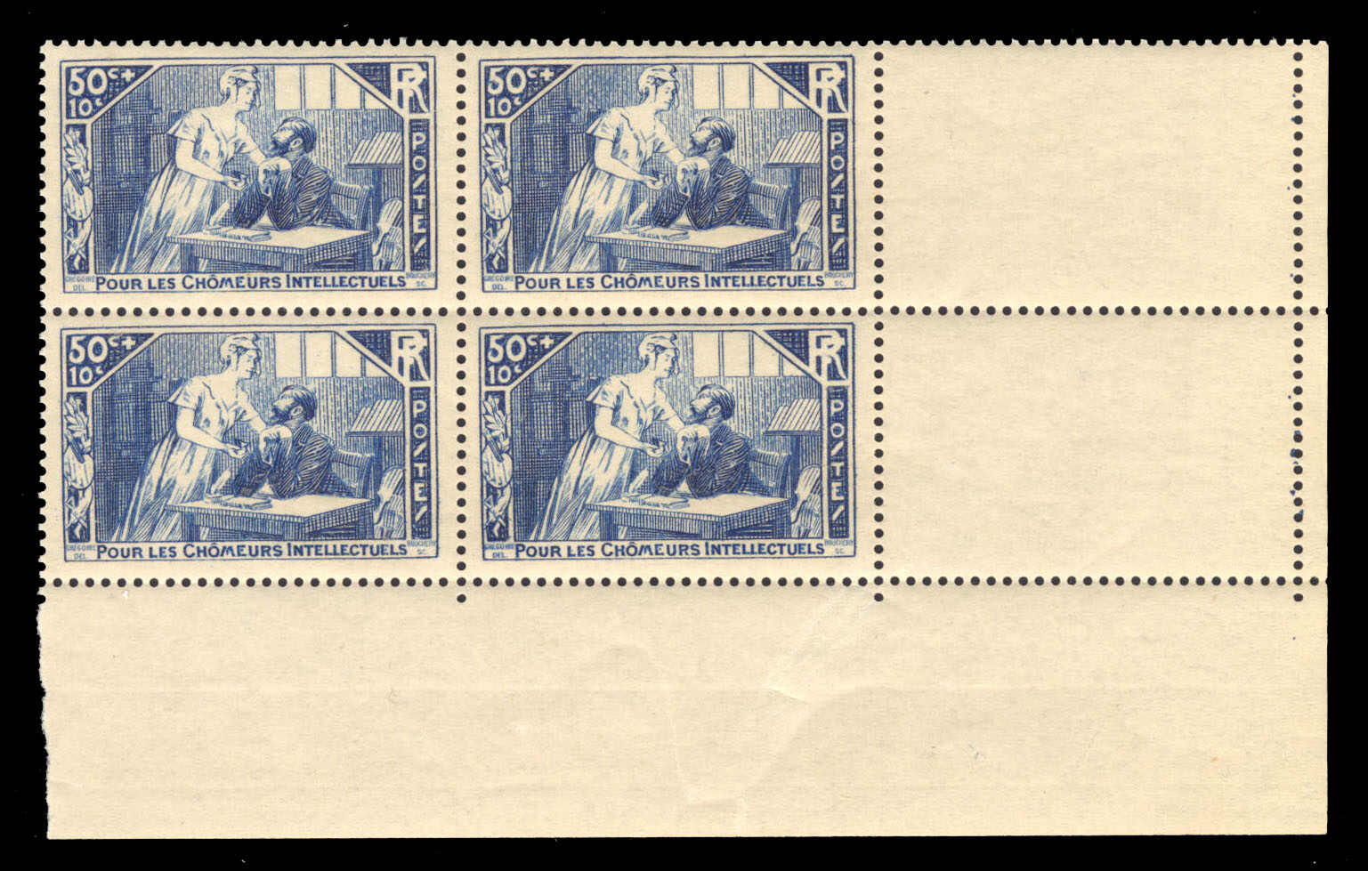 570 nh B42, B43 image1935, 50c+10c & 50c+2fr “Aid for Unemployed Intellectuals”, set of two in lower right corner blocks of four, fresh and very fine. (Image 1) (Image 2)