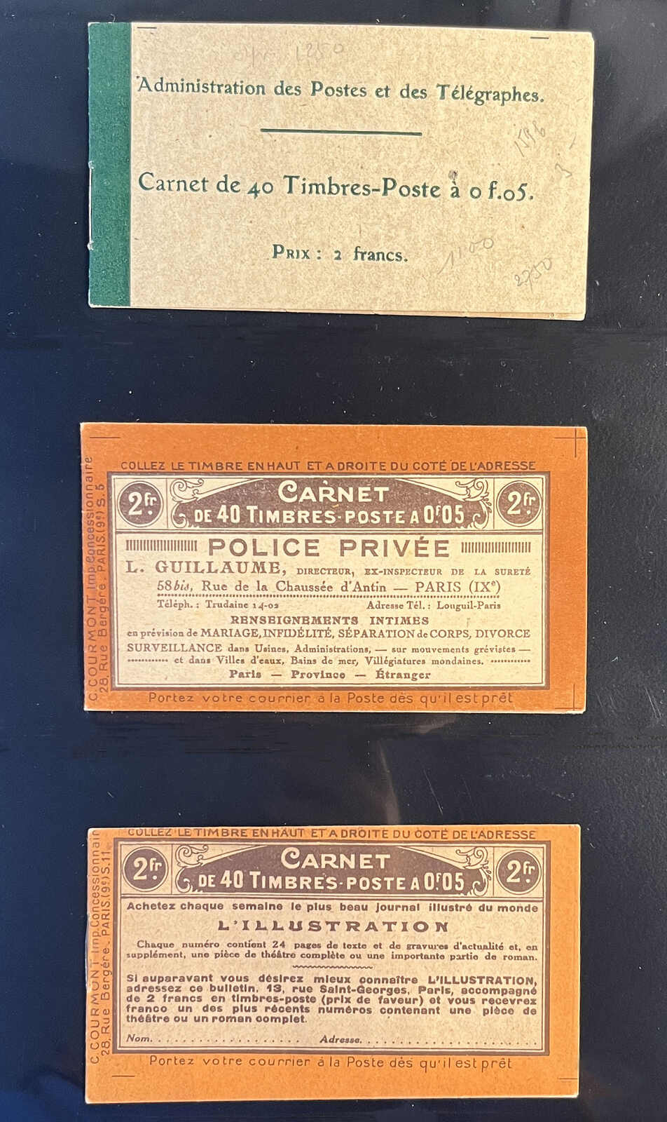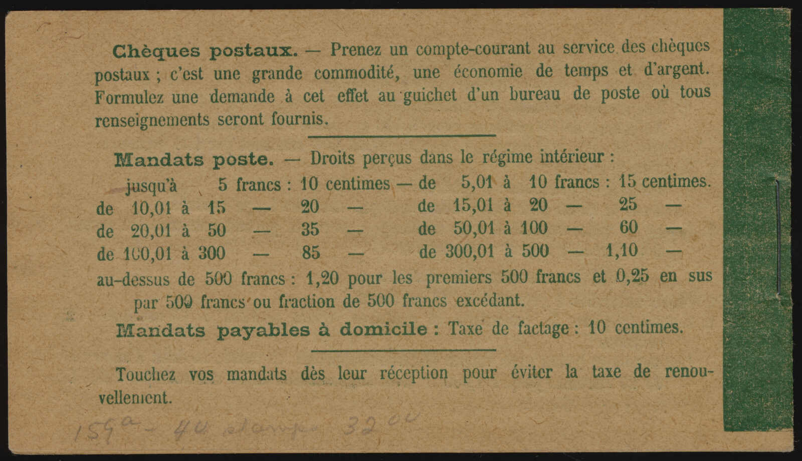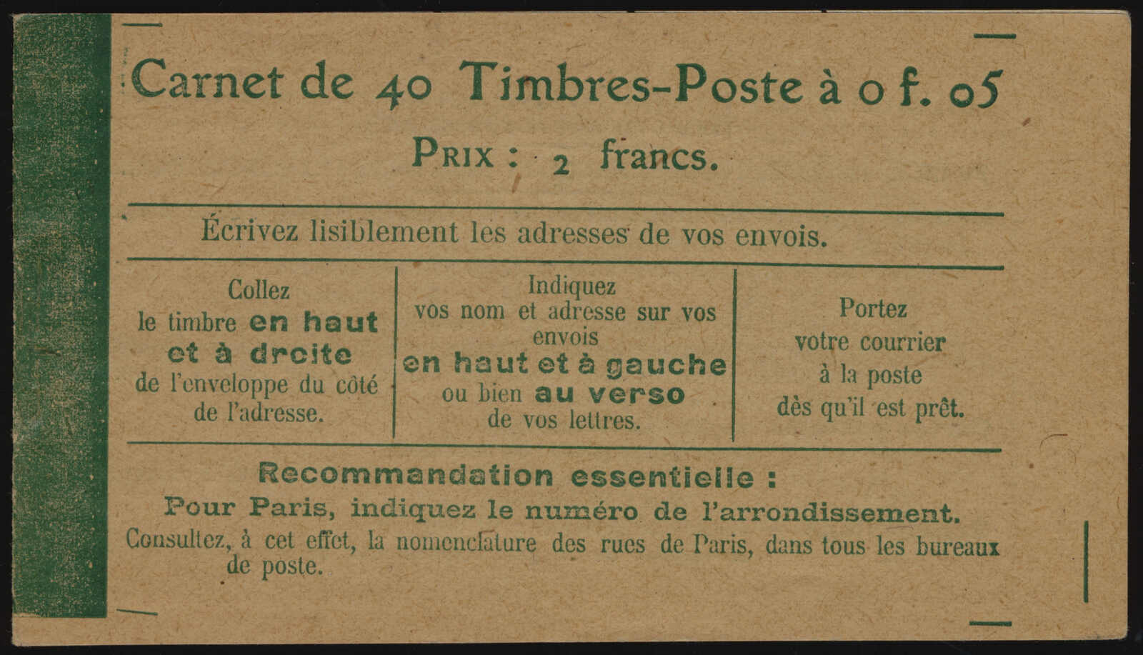578 nh 137-C7 image1919, 5c green Sower, booklet of forty, showing the “taxes révisées le 12 août 1919” inscription on the inside front cover, the stamps well centred for the issue, clean cover, fresh and very fine. (Image 1) (Image 2)