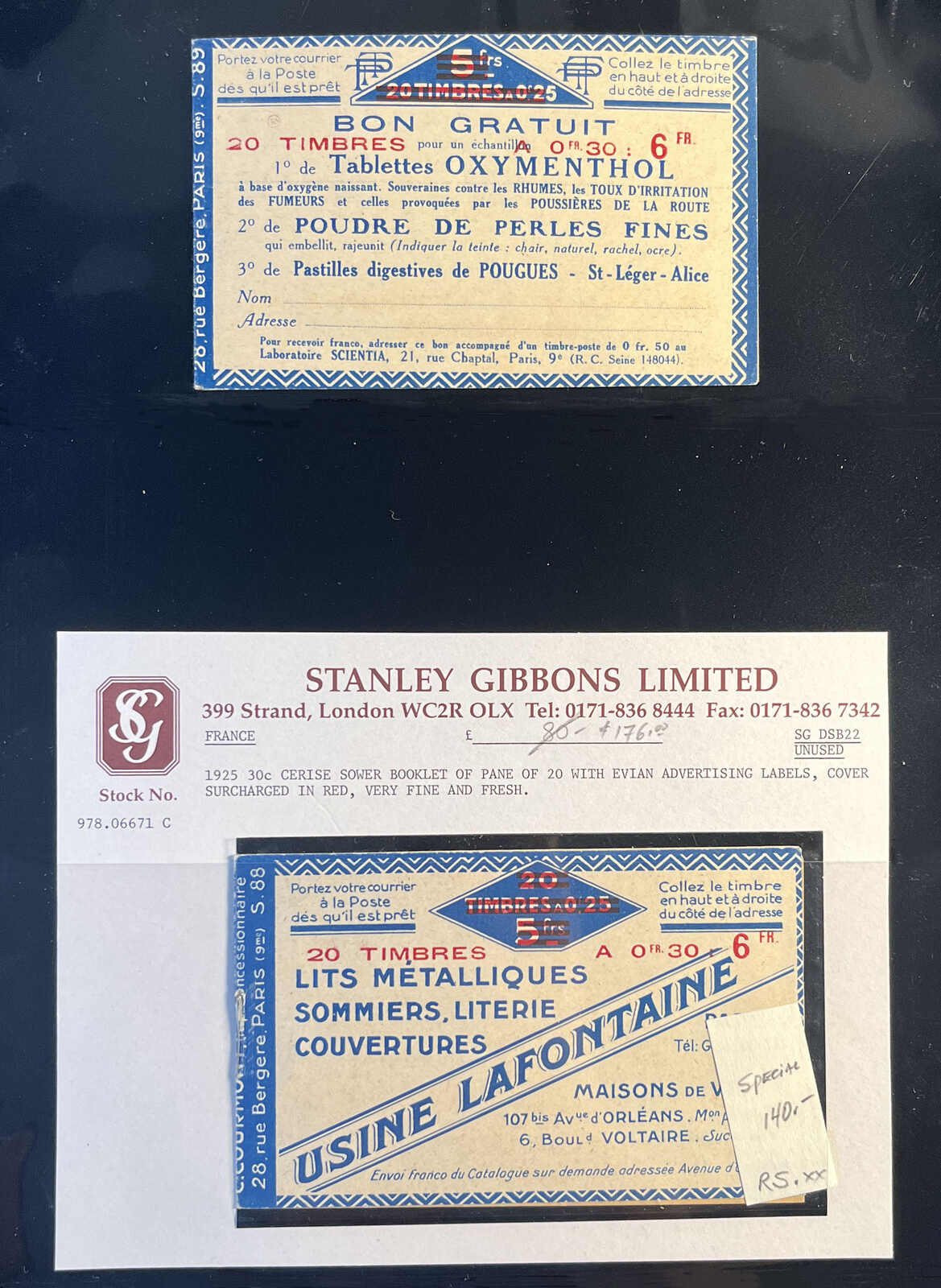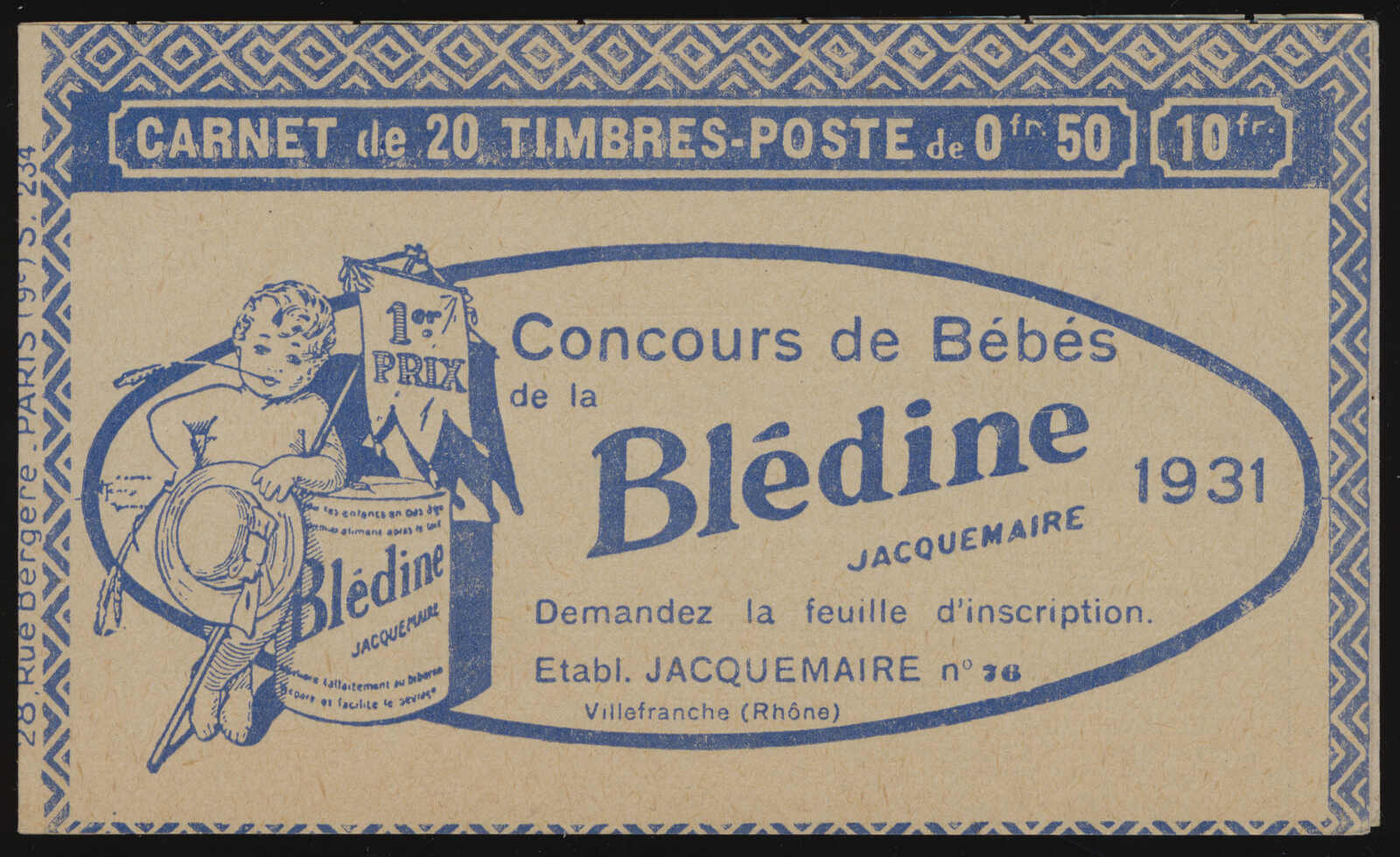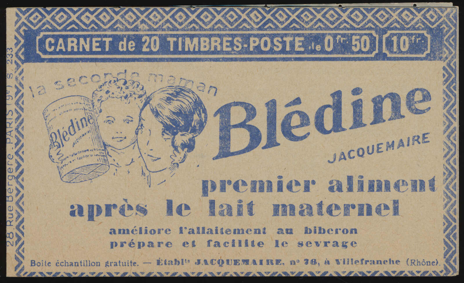 581 nh 199-C50 image1926–1931, two panes of ten 50c shaded Sower booklets, with advertising labels Bledine–Mazda–Benjamin–Benjamin, series S.233 and S.234, both with blue covers depicting infants and a powdered milk tin, pristine condition throughout, purchased from Stanley Gibbons. (Image 1) (Image 2) (Image 3) (Image 4)